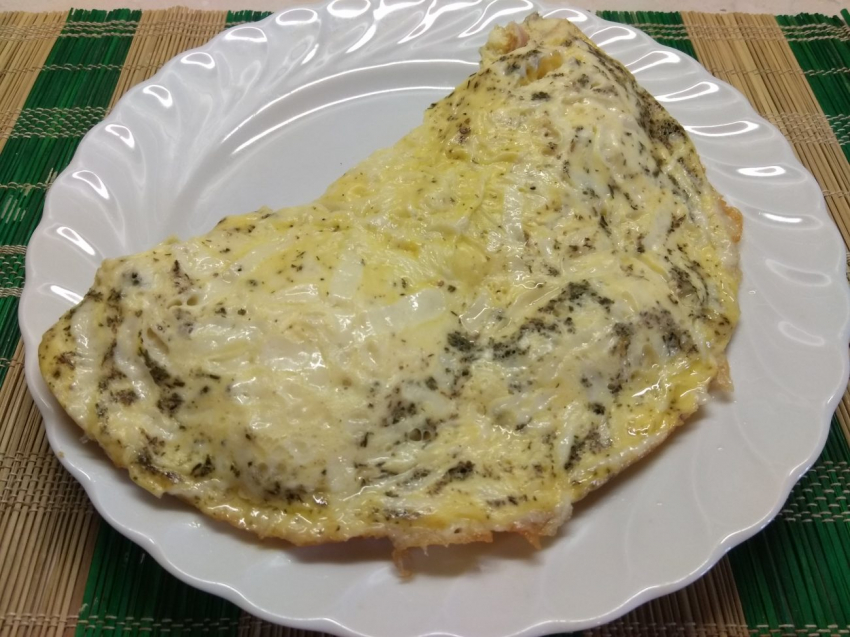 Такой омлет после приготовления получается сытным, но низкокалорийным. Зелень можно брать любую, но лучше всего сюда подойдет петрушка или укроп.