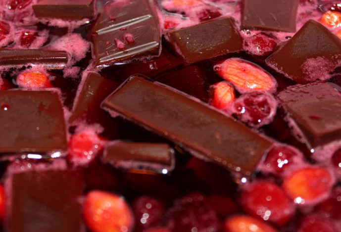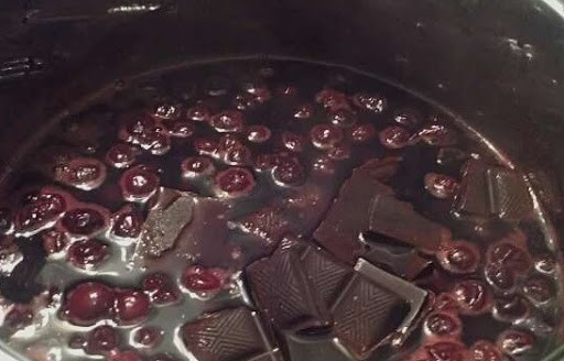 - В теплое сваренное варенье добавить 100 грамм темного шоколада и медленно влить раствор коньяка с какао.
