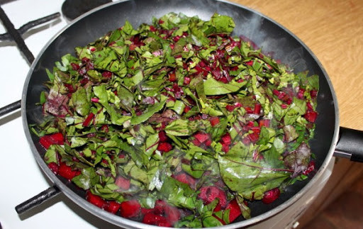 - А за 3 минуты до готовности добавляют в суп молодую порезанную ботву свеклы и варят на небольшом огне.