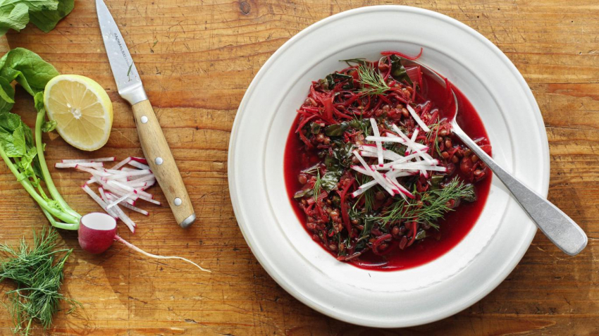 - А в отварную ботву натрем на крупной терке свеклу, потом редиску, предварительно отрезав у нее хвостик и основание. Редиска придаст нашей ботвинье, так же как и лимонный сок, приятную кислинку.