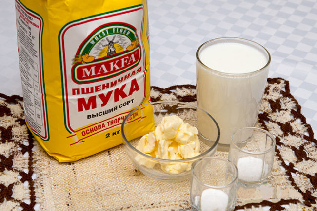 - Замесите плотное тесто из 500 граммов муки, одного яйца, одного стакана кефира, соли и 100 граммов сливочного масла.
