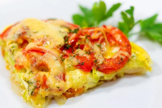 - Сверху распределяется зажарка, которая покрывается ломтиками кабачка.