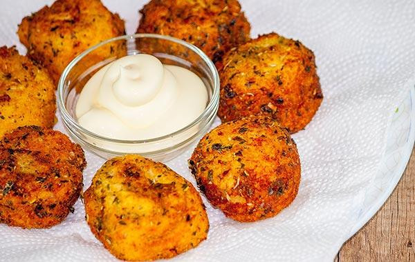 - Подготовленные шарики следует убрать на 1 час в морозильник, чтобы они застыли и не деформировались. Обжарьте заготовки небольшими порциями, чтобы все шарики были на поверхности, до золотисто-коричневого оттенка в кипящем растительном масле или фритюрнице в течение 2–3 мин.