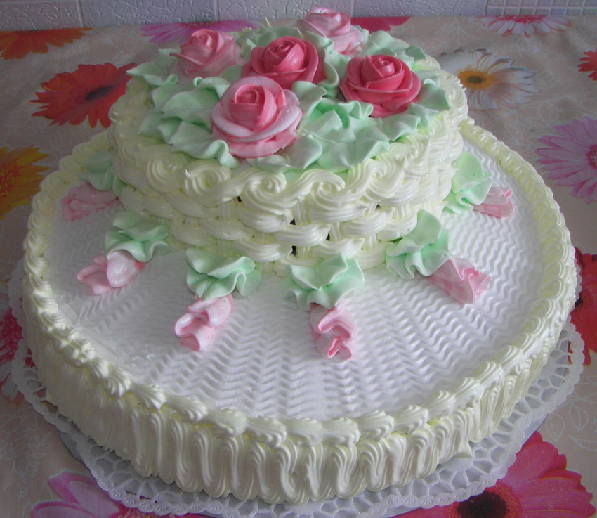 Помните, что с белковым кремом не получается сделать мелкие детали. Лучше всего из него получаются крупные цветы, листья, зигзаги, бортики для торта. Также кремом в домашних условиях можно выровнять торт под мастику или глазурь.