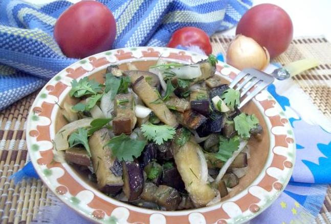 Это салатик для тех, кто любит обжаренные баклажаны. Рецепт очень классный. Такую закуску можно есть сразу после приготовления, а можно закатать на зиму.