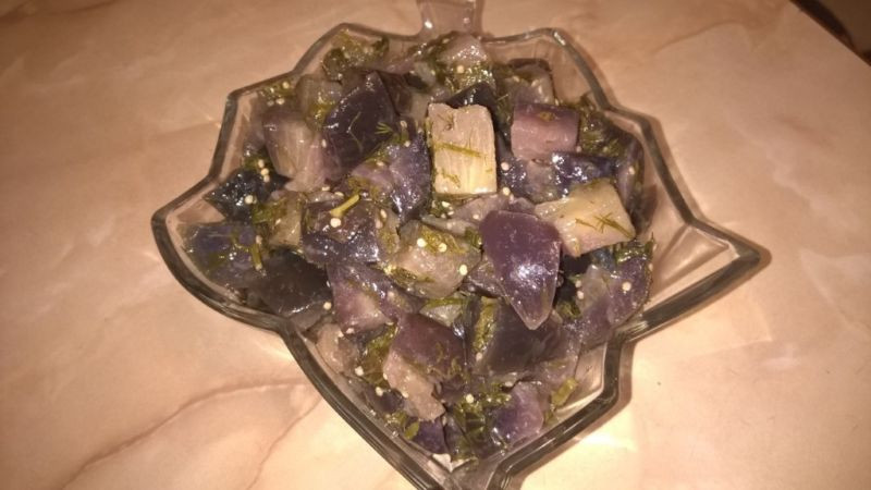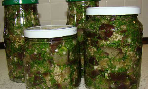 Стерилизованные остренькие баклажаны как грибы с зеленью