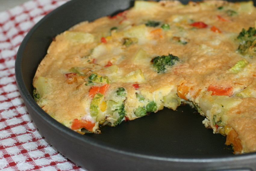 С некоторыми изменениями, касающимися скорее пропорций, ингредиенты соответствуют предыдущему описанию. Готовится омлет в духовке, что гарантированно придаёт таким блюдам пышность.Из чего готовить: