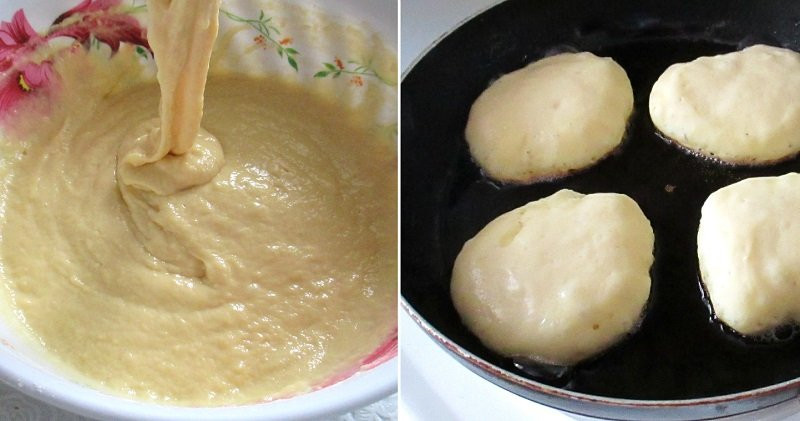 - Удобной небольшой ложкой выливать на сковородку тесто. Готовить по три минуты с каждой стороны до золотого колера.
