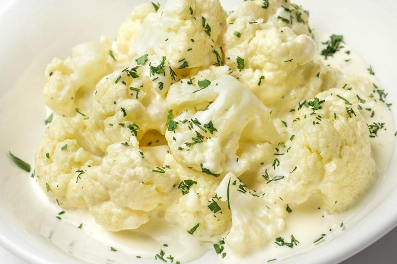 - Готовую цветную капусту выложите на блюдо, полейте сливочным соусом. Оригинальный гарнир готов к подаче.