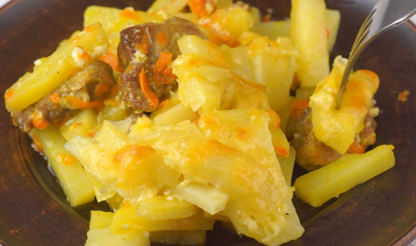 - На дно формы для запекания выкладываем мясо, затем картофель. Сверху посыпаем тёртым сыром, накрываем крышкой или фольгой.