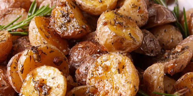 - Выложите картошку на противень, полейте её маслом, посыпьте измельчённым чесноком, солью, перцем и рубленым розмарином. Оставьте несколько веточек розмарина для сервировки.