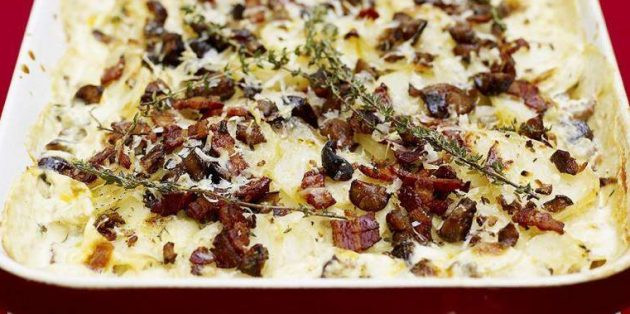 - Картофель очистите и нарежьте тонкими кружочками. Добавьте картошку и большую часть измельчённого тимьяна в кастрюлю с молоком. Перемешайте и выложите в прямоугольную форму для запекания, смазанную сливочным маслом.