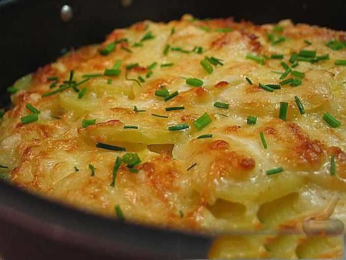- Посыпьте тёртым пармезаном и поставьте в разогретую до 200 °C духовку примерно на час. Если картошка начнёт немного подгорать, накройте форму фольгой.