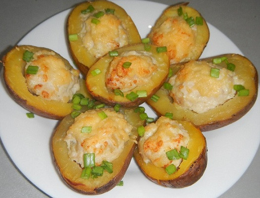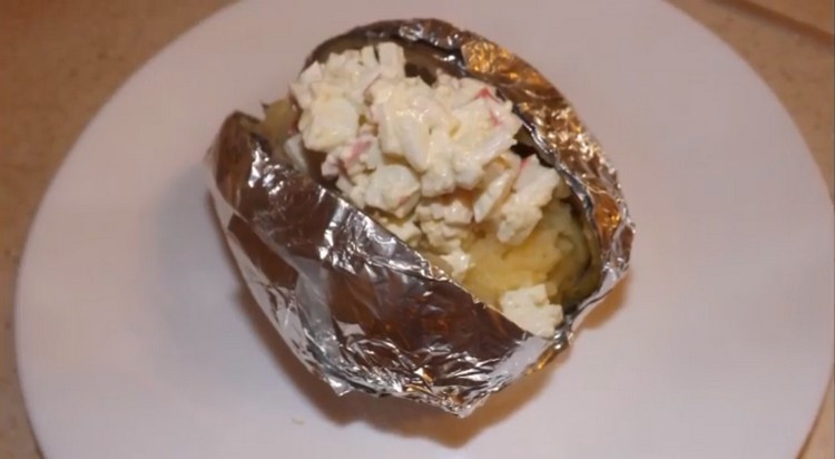 - Готовые клубни надрезают, внутрь накладывают соус.