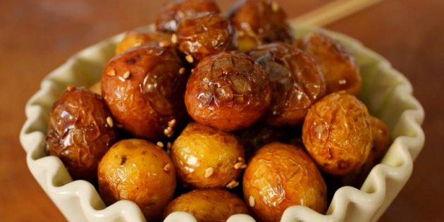 Молодая картошка в глазури из соевого соуса, мёда и чеснока