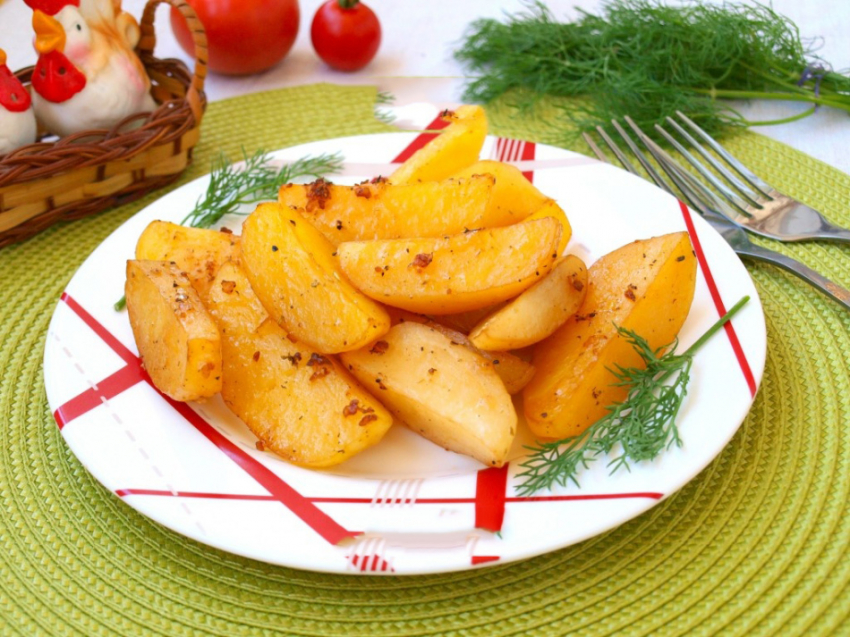 - Поместите картошку в заранее разогретую духовку и запекайте до готовности.