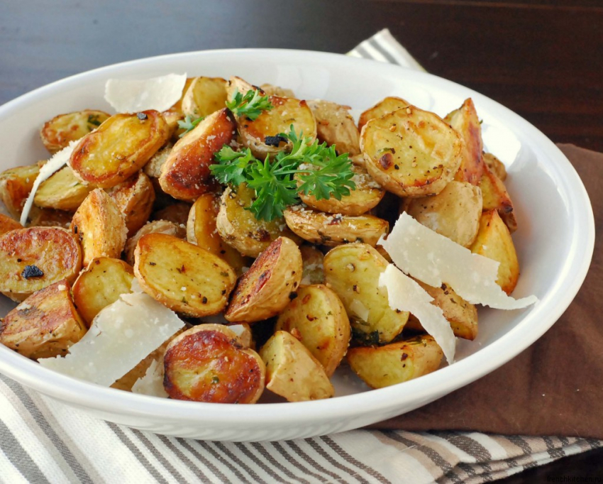 - Противень застилаем пергаментной бумагой, высыпаем на него картофель в один слой. Отправляем в разогретую духовку до 190 градусов на 30 минут.