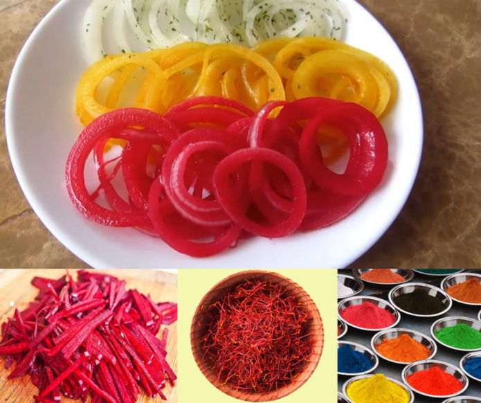 - Жидкость остужают, добавляют выбранный краситель. Шафран придаст овощу насыщенный жёлтый цвет, кусочки свёклы — тёмно-красный, пищевой краситель — какой угодно.