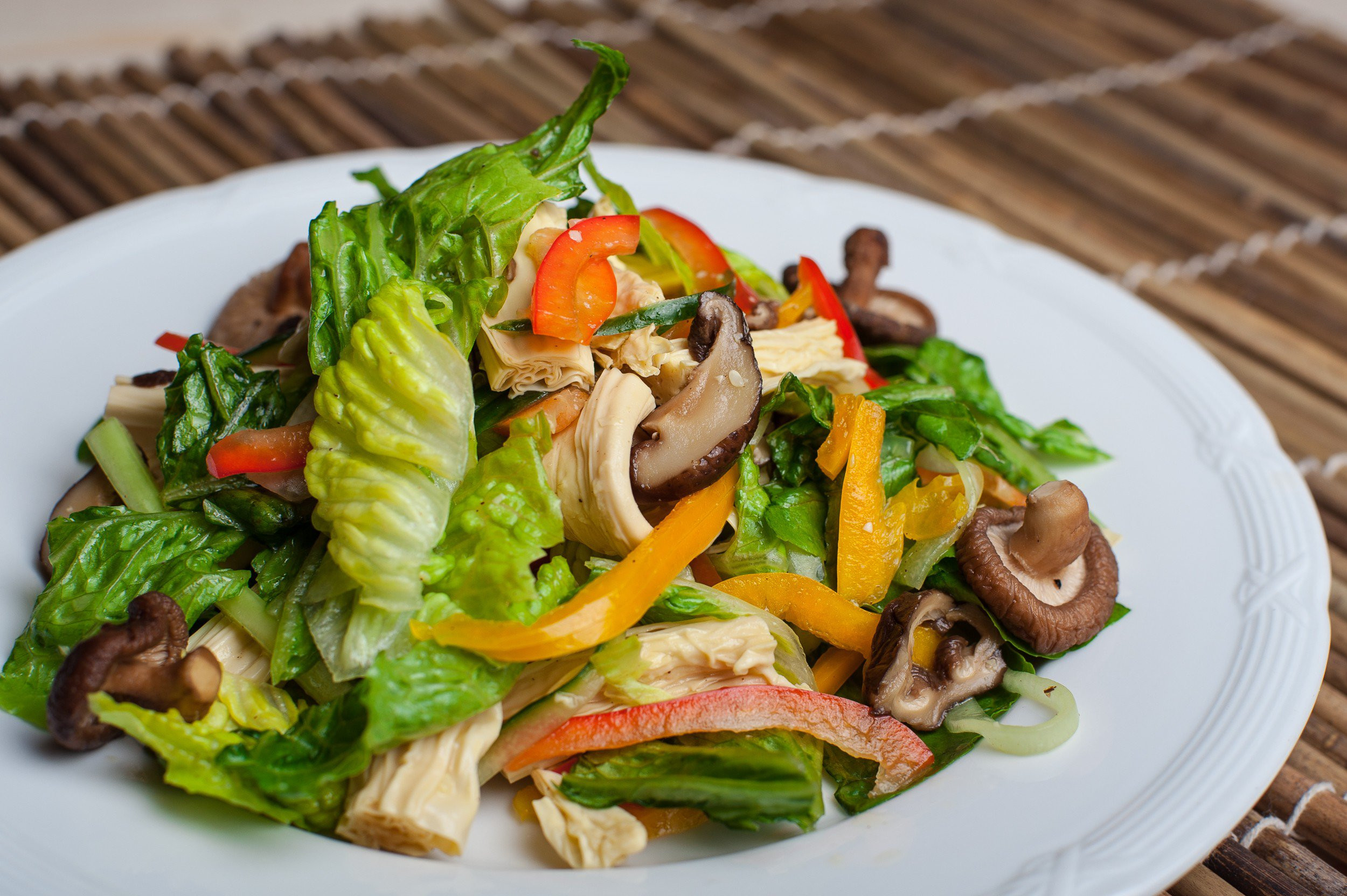 - Выкладываем на тарелку зелень и овощи, поливаем приготовленной заправкой и тщательно перемешиваем.