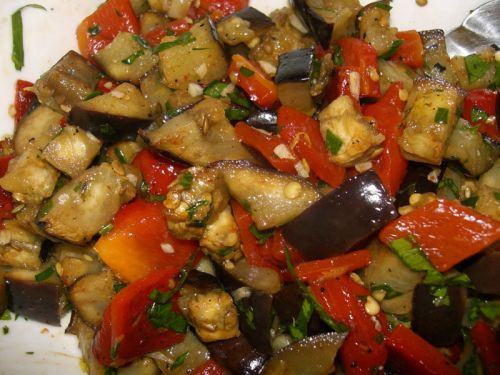 - Вилкой разминают мякоть баклажанов, перец аккуратно режут ножом или просто рвут на мелкие кусочки пальцами.