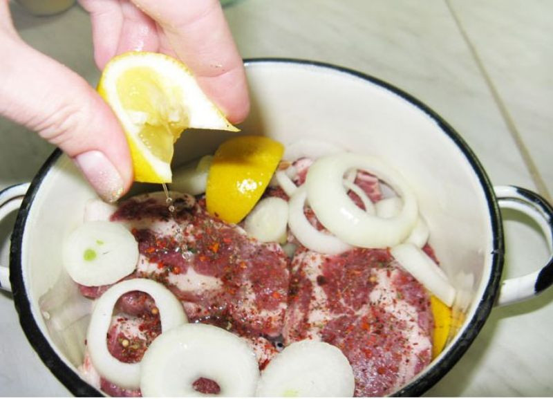 - В таком виде мясо оставляют на один час, после добавляют к маринаду сок из двух лимонов, и дают свинине пропитаться в течение пяти часов.