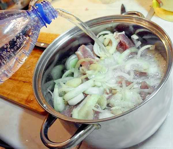 - В емкость со свининой наливают минеральную воду и оставляют в таком виде мясо на один час.