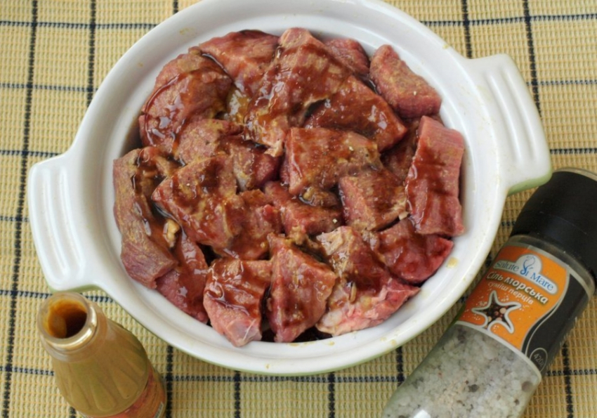 - Говядину или телятину помыть и обсушить. Затем порезать средними кусочками. Переложить в стеклянную, или глиняную миску. Металлическую посуду лучше не использовать, чтобы мясо не окислилось.