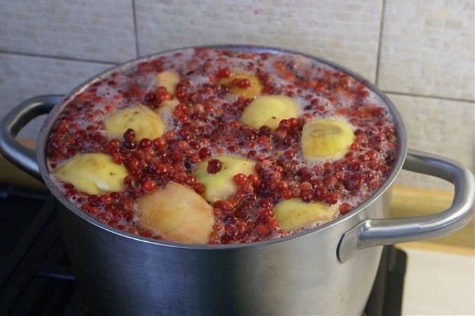 После того как сахар полностью растворится, добавляют нарезанные яблочные кусочки и проваривают в течение четверти часа. Вынимают фруктовые дольки, бросают в отвар бруснику и варят до тех пор, пока ягоды в компоте обесцветятся.