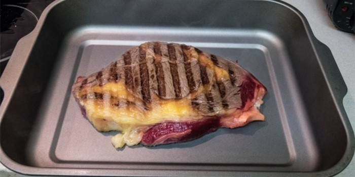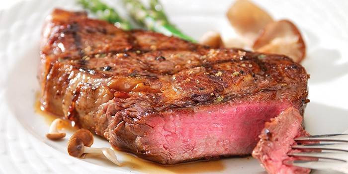 Когда обе стороны покрываются золотистой корочкой, то мясо считать слабо прожаренным. Кулинарный процесс занимает в среднем 5 минут. Если подержать говядину на огне еще 4 минуты (по 2 мин. с каждой стороны), то стейк получится средней прожарки, плюс еще 8-10 минут дают степень «well done». Готовность определяют проколом вилкой: красноватый сок говорит о полусыром состоянии, светлый – о полной прожарке.