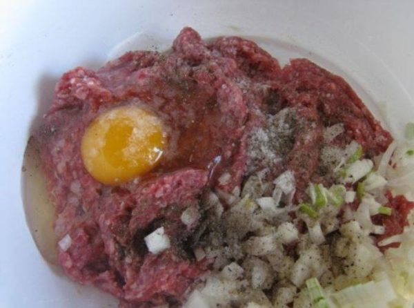 - Рубленый лук добавляется в вымешанный фарш перед жаркой.