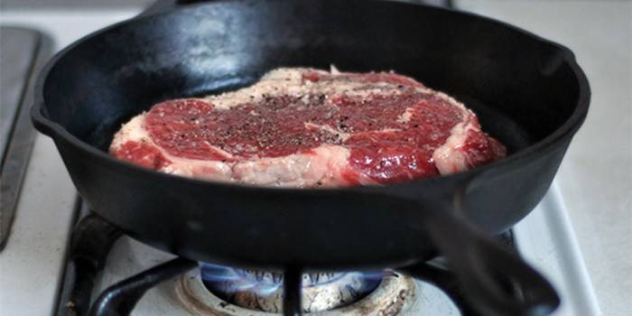 - На раскаленной сковороде быстро обжариваем мясо с двух сторон (примерно по три минуты).