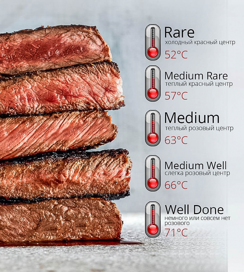Во многих европейских ресторанах могут предложить гостям пять видов прожарки:- Rare — мясо с кровью, которое готовится не более 3 минут при температуре 200 градусов. Внутри мякоть имеет насыщенный красный цвет. Сверху стейк слегка подрумянивается.