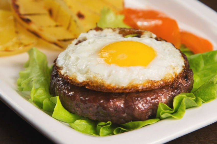 Сочная говядина, жареный сладковатый лук, яйцо, а если ко всему этому добавить еще бутылку красного вина, то обычный ужин превращается в истинное наслаждение. Рецепт не претендует на классику, но благодаря некоторым хитростям позволяет приготовить из заурядных продуктов красивое, вкусное и изысканное блюдо даже тем, у кого нет необходимого опыта.- говядина — 400 г;