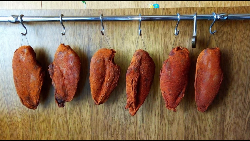 - Обваленные таким образом куски филе подвесить на крючки и сушить на воздухе в прохладном месте в гигиенических условиях в течение трех дней.