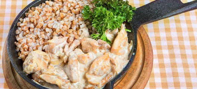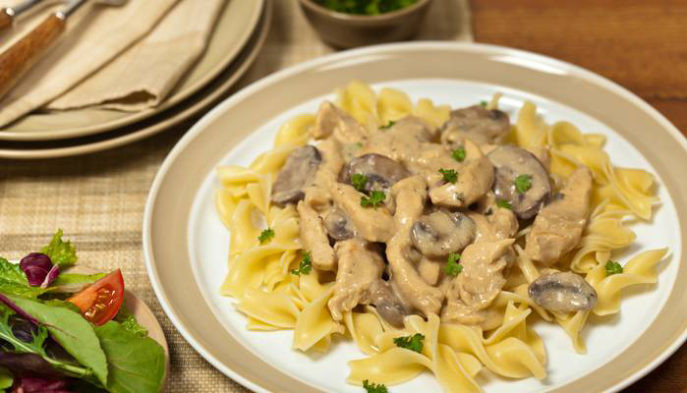 Более сытное блюдо — бефстроганов из курицы с грибами. Лучше всего подойдут шампиньоны или вешенки, рекомендуется добавить немного лесных грибов, у которых более яркий аромат. Но предварительно их проваривают. При обжаривании мяса можно добавить карри, приправа придает золотистый оттенок.