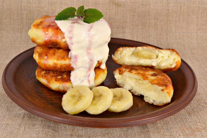 Это блюдо можно назвать особенным. Дело в том, что банан добавляется не в тесто, а вкладывается внутрь творожной лепешки. Получается очень оригинальное и вкусное блюдо.