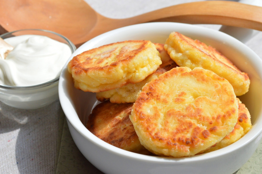 - Из теста формируются небольшие лепешки. Они обваливаются в муке и обжариваются на сковороде с двух сторон, после чего в горячем виде подаются к столу со сметаной.