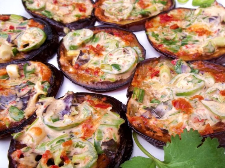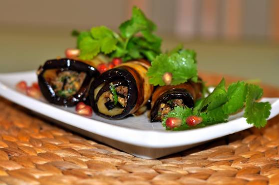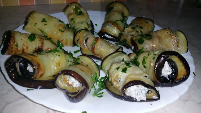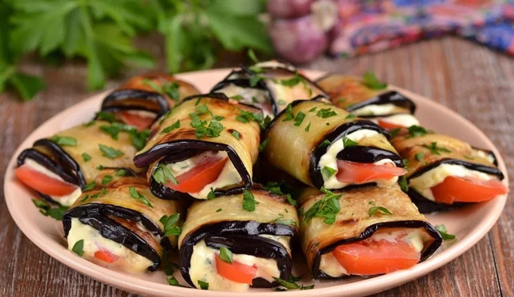 Жареные рулетики из баклажанов с чесноком и помидорами