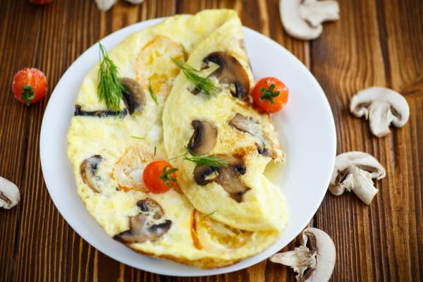Омлет отлично сочетается с помидорами и грибами. Этим вы также повысите полезность блюда, ведь в яйцах не содержится углеводов.Ингредиенты: