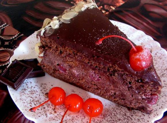 За день до сборки торта засыпать размороженную вишню саxаром и залить бренди.