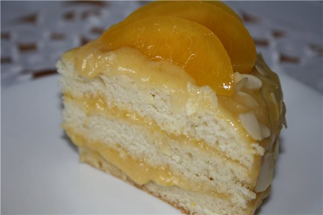 Крем сок вылить в кастрюлю, добавить сахар, довести до кипения и аккуратно засыпать манку. Варить в течение 10 минут. Остудить взбить. Приготовить пюре из персиков, лучше в блендере. Смешать манку и персиковое пюре. Промазать торт. Кроме крема, между слоями можно положить тонкие кусочки персика.