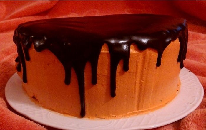 В отдельной ёмкости взбейте в густую пену на средней, а потом на высокой скорости сливки (не менее 30 % жирности), сахарную пудру и оранжевый пищевой краситель. Ложкой осторожно смешайте взбитые сливки с кремом из слив. масла. Получившимся кремом промажьте коржи, верх и бока торта. Поставьте в холодильник на 30 минут.
