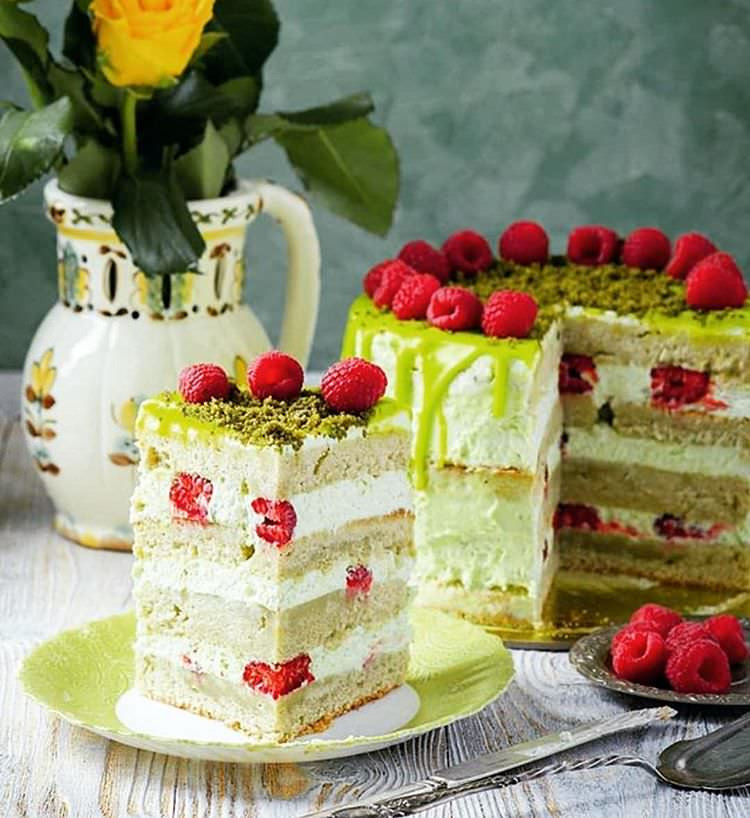 Для крема взбить сливки, сметану и сахарную пудру. Потом добавить фисташки и перемешать. При желании можно сделать крем зелёным, добавив несколько капель шпинатного сока или сока петрушки, или пищевого красителя. Испечённый и остывший бисквит разрезать на три коржа, и прослоить кремом.