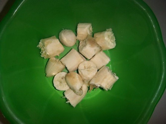 - С бананов снимем кожуру, разрежем их на несколько частей и выложим в отдельную посуду. Совет: выбирайте спелые и мягкие бананы.