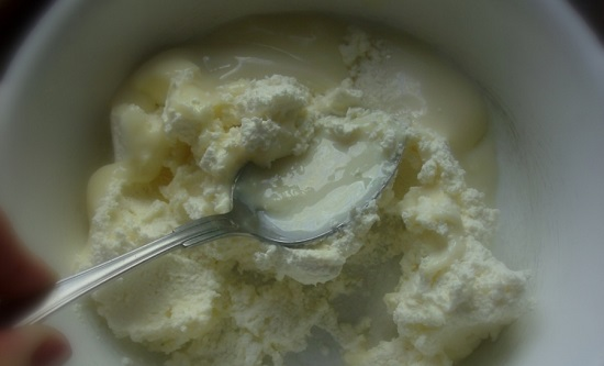 - В отдельной посуде перетираем творог и смешиваем его со сгущенным молоком. Тщательно взбиваем полученную смесь миксером либо блендером.