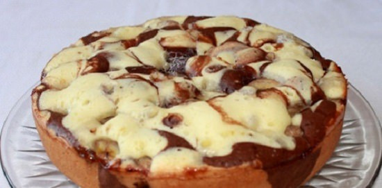 - Аккуратно извлекаем банановый десерт, а поскольку он сверху сильно не запекается, переворачиваем его вверх дном. По желанию можете посыпать кекс какао-порошком либо пудрой сахарной.