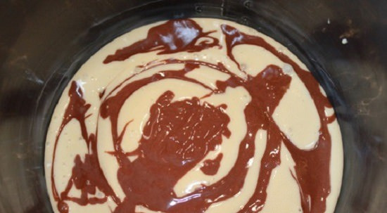 - Мультичашу смазываем маслом сливочным и по очереди выкладываем частями коричневую и белую основу. Делаем это в произвольном порядке, получится красиво.