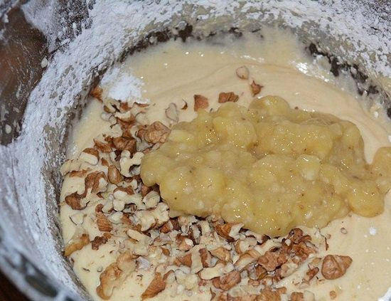 - Выкладываем в тесто бананы и измельченные орехи. Вымешиваем основу.