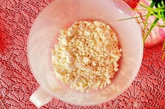- Как только вода стечет, можем приступать к приготовлению творожного теста.