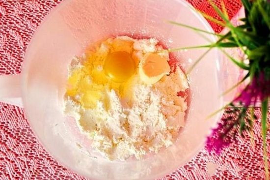 - Добавим яйцо и сливочное масло в пиалу с творогом. Все тщательно перемешаем. Лучше использовать для этих целей вилку или венчик.